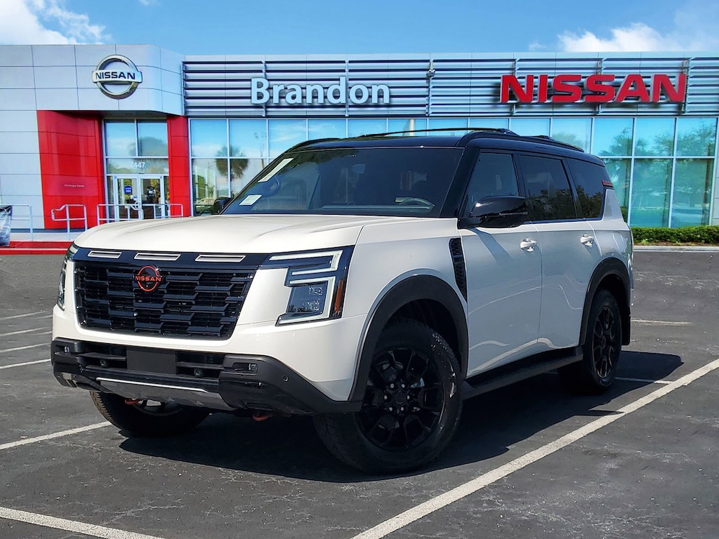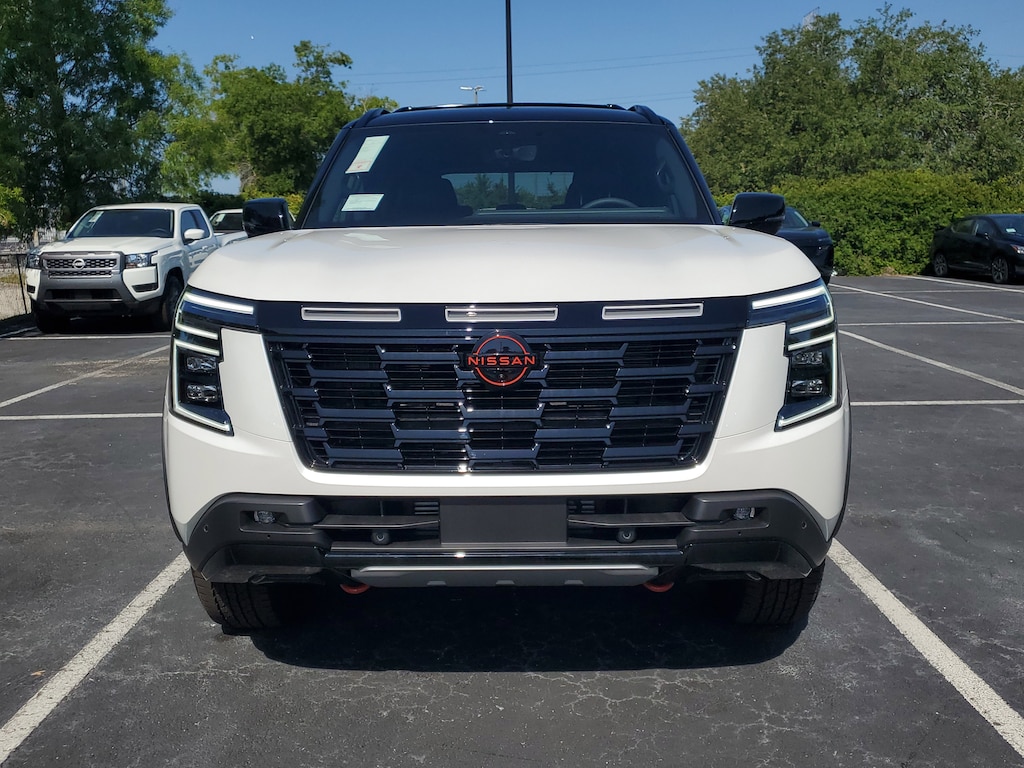 New 2025 Nissan Armada PRO-4X [B93] PRO-4X MUD GUARDS, ASPEN WHITE TRICOAT/SUPER BLACK, [L94] PRO-4X CARPETED FLOOR MATS -inc: cargo area protector first aid kit and cargo blocks, [T11] FRONT TOW HOOKS, [E07] PREMIUM PAINT & 2-TONE ROOF, [B95] ROOF RAIL CROSS BARS, CHARCOAL PRO-4X UNIQUE QUILTED LEATHER SEAT TRIM -inc: stitching, Turbocharged, Smart Device Integration, Requires Subscription, Four Wheel Drive, Locking/Limited Slip Differential, Tow Hitch, Air Suspension, Active Suspension, Power Steering, Air Suspension, Air Suspension, ABS, 4-Wheel Disc Brakes, Brake Assist, Aluminum Wheels, Tires - Front All-Terrain, Tires - Rear All-Terrain, Temporary Spare Tire, Tow Hooks, Tow Hooks, Heated Mirrors, Power Mirror(s), Integrated Turn Signal Mirrors, Power Folding Mirrors, Rear Defrost, Privacy Glass, Intermittent Wipers, Variable Speed Intermittent Wipers, Rain Sensing Wipers, Rear Spoiler, Running Boards/Side Steps, Remote Trunk Release, Power Liftgate, Power Door Locks, Daytime Running Lights, Automatic Headlights, LED Headlights, Automatic Highbeams, Fog Lamps, AM/FM Stereo, Navigation System, Premium Sound System, Satellite Radio, MP3 Capability, Bluetooth Connection, Telematics, Auxiliary Audio Input, HD Radio, WiFi Hotspot, Smart Device Integration, Requires Subscription, MP3 Capability, Steering Wheel Audio Controls, Auxiliary Audio Input, Bluetooth Connection, Power Driver Seat, Power Passenger Seat, Bucket Seats, Heated Front Seat(s), Driver Adjustable Lumbar, Passenger Adjustable Lumbar, Seat Memory, Pass-Through Rear Seat, Rear Bench Seat, Adjustable Steering Wheel, Trip Computer, Power Windows, WiFi Hotspot, 3rd Row Seat, Leather Steering Wheel, Heated Steering Wheel, Keyless Entry, Power Door Locks, Keyless Start, Keyless Entry, Power Door Locks, Universal Garage Door Opener, Cruise Control, Adaptive Cruise Control, Climate Control, Multi-Zone A/C, A/C, A/C, Rear A/C, Woodgrain Interior Trim, Leather Seats, Driver Vanity Mirror, Passenger Vanity Mirror, Driver Illuminated Vanity Mirror, Passenger Illuminated Visor Mirror, Auto-Dimming Rearview Mirror, Smart Device Integration, Mirror Memory, Seat Memory, Remote Engine Start, Keyless Start, Navigation System, Power Windows, Power Door Locks, Trip Computer, Mirror Memory, Seat Memory, Security System, Immobilizer, Cruise Control Steering Assist, Traction Control, Stability Control, Traction Control, Front Side Air Bag, Rear Parking Aid, Automatic Parking, Blind Spot Monitor, Cross-Traffic Alert, Rear Collision Mitigation, Lane Departure Warning, Lane Keeping Assist, Lane Departure Warning, Front Collision Mitigation, Driver Monitoring, Telematics, Requires Subscription, Aerial View Display System, Tire Pressure Monitor, Driver Air Bag, Passenger Air Bag, Front Head Air Bag, Rear Head Air Bag, Passenger Air Bag Sensor, Knee Air Bag, Child Safety Locks, Back-Up Camera