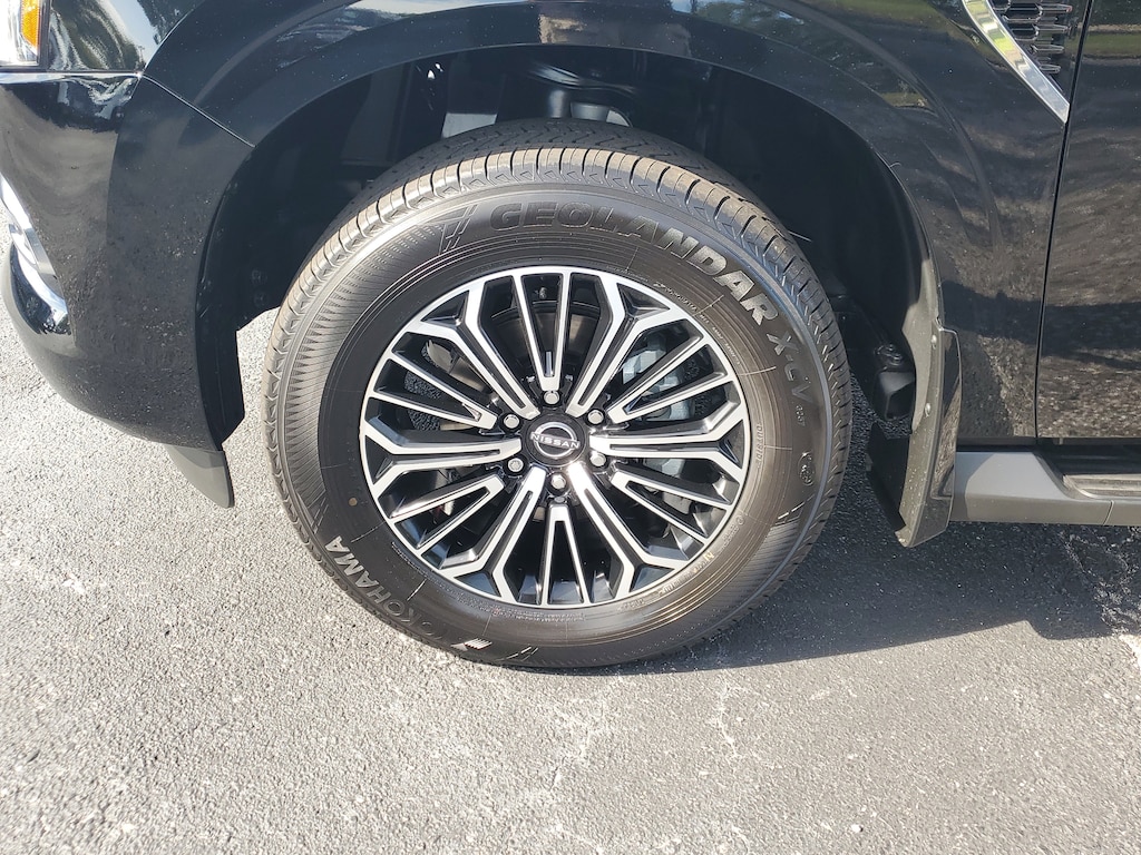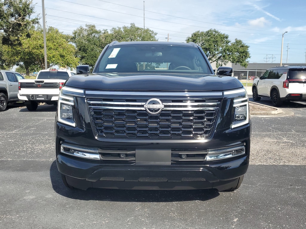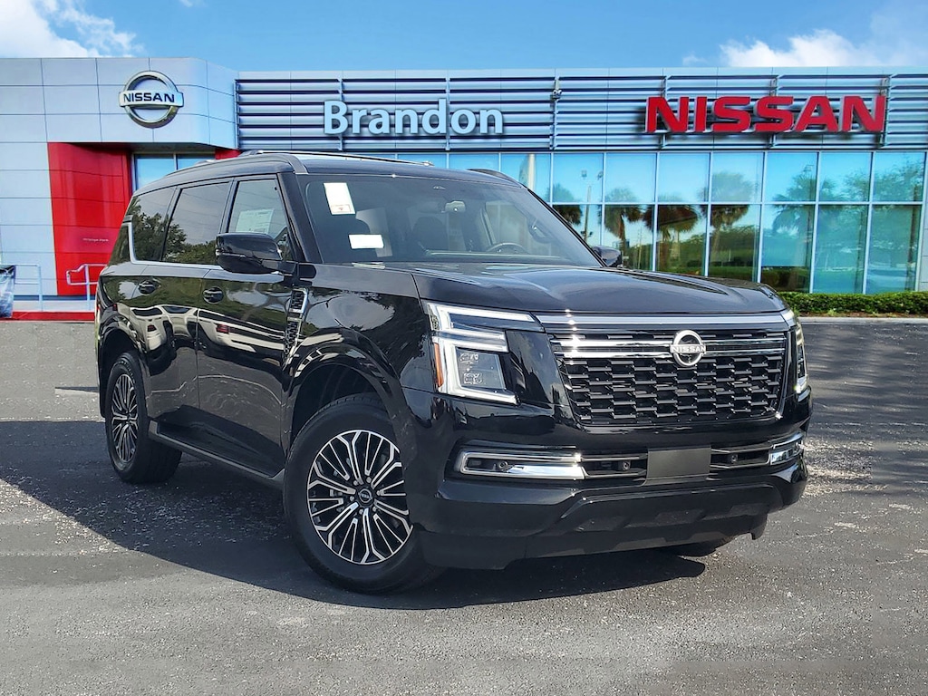 New 2025 Nissan Armada SL [B11] CENTER FRONT SPOILER, [B92] SPLASH GUARDS, CHARCOAL W/ESPRESSO TAILORFIT SEAT TRIM, SUPER BLACK, [X01] CAPTAIN'S CHAIR SEAT PACKAGE -inc: Replaces 2nd-row split-bench seat Passenger capacity decreases from 8 to 7 2nd Row Outboard Captain's Chairs w/Armrests 2nd Row Center Console w/2 Cupholders EZ Flex 2nd-Row Seating System w/1-Touch Release, [B95] ROOF RAIL CROSS BARS, [L92] CARPETED FLOOR MATS - CAPTAIN CHAIRS -inc: cargo area protector first aid kit and cargo blocks, Turbocharged, Smart Device Integration, Requires Subscription, Four Wheel Drive, Tow Hitch, Power Steering, ABS, 4-Wheel Disc Brakes, Brake Assist, Aluminum Wheels, Tires - Front All-Season, Tires - Rear All-Season, Temporary Spare Tire, Tow Hooks, Tow Hooks, Heated Mirrors, Power Mirror(s), Integrated Turn Signal Mirrors, Power Folding Mirrors, Rear Defrost, Privacy Glass, Intermittent Wipers, Variable Speed Intermittent Wipers, Rain Sensing Wipers, Rear Spoiler, Running Boards/Side Steps, Remote Trunk Release, Power Liftgate, Power Door Locks, Daytime Running Lights, Automatic Headlights, LED Headlights, Automatic Highbeams, AM/FM Stereo, Navigation System, Premium Sound System, Satellite Radio, MP3 Capability, Bluetooth Connection, Telematics, Auxiliary Audio Input, HD Radio, WiFi Hotspot, Smart Device Integration, Requires Subscription, MP3 Capability, Steering Wheel Audio Controls, Auxiliary Audio Input, Bluetooth Connection, Power Driver Seat, Power Passenger Seat, Bucket Seats, Heated Front Seat(s), Driver Adjustable Lumbar, Passenger Adjustable Lumbar, Seat Memory, Pass-Through Rear Seat, Rear Bench Seat, Adjustable Steering Wheel, Trip Computer, Power Windows, WiFi Hotspot, 3rd Row Seat, Leather Steering Wheel, Heated Steering Wheel, Keyless Entry, Power Door Locks, Keyless Start, Keyless Entry, Power Door Locks, Universal Garage Door Opener, Cruise Control, Adaptive Cruise Control, Climate Control, Multi-Zone A/C, A/C, A/C, Rear A/C, Woodgrain Interior Trim, Premium Synthetic Seats, Driver Vanity Mirror, Passenger Vanity Mirror, Driver Illuminated Vanity Mirror, Passenger Illuminated Visor Mirror, Auto-Dimming Rearview Mirror, Smart Device Integration, Mirror Memory, Seat Memory, Remote Engine Start, Keyless Start, Navigation System, Power Windows, Power Door Locks, Trip Computer, Mirror Memory, Seat Memory, Security System, Immobilizer, Cruise Control Steering Assist, Traction Control, Stability Control, Traction Control, Front Side Air Bag, Rear Parking Aid, Automatic Parking, Blind Spot Monitor, Cross-Traffic Alert, Rear Collision Mitigation, Lane Departure Warning, Lane Keeping Assist, Lane Departure Warning, Front Collision Mitigation, Driver Monitoring, Telematics, Requires Subscription, Aerial View Display System, Tire Pressure Monitor, Driver Air Bag, Passenger Air Bag, Front Head Air Bag, Rear Head Air Bag, Passenger Air Bag Sensor, Knee Air Bag, Child Safety Locks, Back-Up Camera