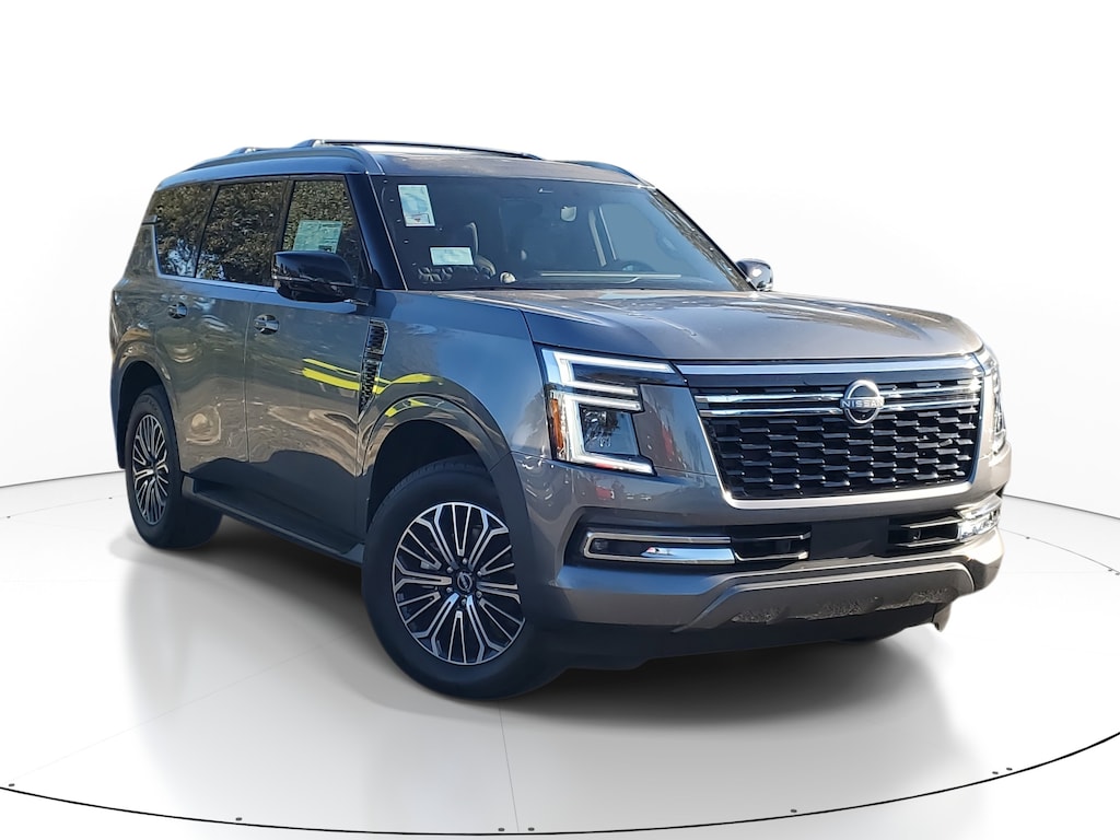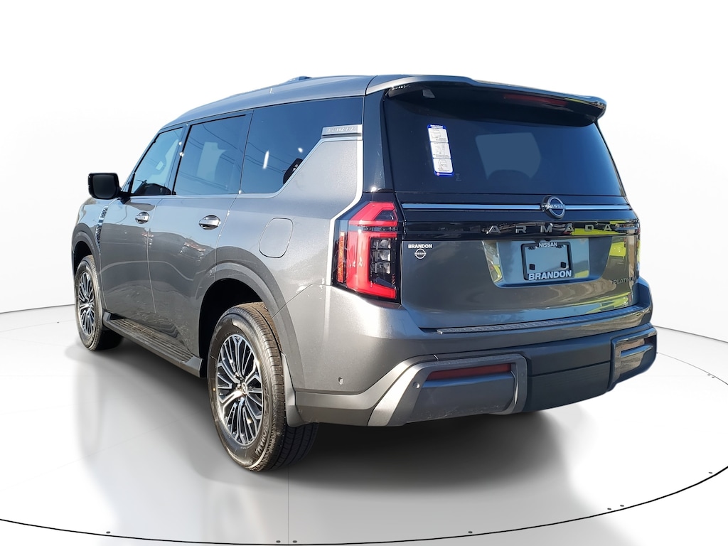 New 2026 Nissan Armada Platinum [B94] REAR BUMPER PROTECTOR, [B11] CENTER FRONT SPOILER, [B95] CROSS BARS, [L92] CARPETED FLOOR MATS W/CAPTAIN CHAIRS -inc: cargo area protector first aid kit and cargo blocks, [B92] SPLASH GUARDS, GUN METALLIC, CHARCOAL W/ESPRESSO QUILTED LEATHER SEAT TRIM, [N92] ILLUMINATED KICK PLATES, Turbocharged, Remote Engine Start, Four Wheel Drive, Tow Hitch, Power Steering, ABS, 4-Wheel Disc Brakes, Brake Assist, Aluminum Wheels, Tires - Front All-Season, Tires - Rear All-Season, Temporary Spare Tire, Sun/Moonroof, Generic Sun/Moonroof, Panoramic Roof, Tow Hooks, Tow Hooks, Heated Mirrors, Power Mirror(s), Integrated Turn Signal Mirrors, Power Folding Mirrors, Rear Defrost, Privacy Glass, Intermittent Wipers, Variable Speed Intermittent Wipers, Rain Sensing Wipers, Rear Spoiler, Running Boards/Side Steps, Remote Trunk Release, Power Liftgate, Power Door Locks, Daytime Running Lights, Automatic Headlights, LED Headlights, Automatic Highbeams, Fog Lamps, AM/FM Stereo, Navigation System, Premium Sound System, Satellite Radio, MP3 Capability, Bluetooth Connection, Telematics, Auxiliary Audio Input, HD Radio, WiFi Hotspot, Smart Device Integration, Requires Subscription, MP3 Capability, Steering Wheel Audio Controls, Bluetooth Connection, Power Driver Seat, Power Passenger Seat, Bucket Seats, Heated Front Seat(s), Driver Adjustable Lumbar, Passenger Adjustable Lumbar, Seat Memory, Cooled Front Seat(s), Bucket Seats, Rear Bucket Seats, Heated Rear Seat(s), Adjustable Steering Wheel, Trip Computer, Power Windows, WiFi Hotspot, 3rd Row Seat, Leather Steering Wheel, Heated Steering Wheel, Keyless Entry, Power Door Locks, Keyless Start, Keyless Entry, Power Door Locks, Hands-Free Liftgate, Universal Garage Door Opener, Cruise Control, Adaptive Cruise Control, A/C, Rear A/C, Climate Control, Multi-Zone A/C, A/C, Woodgrain Interior Trim, Leather Seats, Driver Vanity Mirror, Passenger Vanity Mirror, Driver Illuminated Vanity Mirror, Passenger Illuminated Visor Mirror, Auto-Dimming Rearview Mirror, Smart Device Integration, Requires Subscription, Smart Device Integration, Mirror Memory, Seat Memory, Keyless Start, Navigation System, Power Windows, Power Door Locks, Trip Computer, Mirror Memory, Seat Memory, Security System, Immobilizer, Cruise Control Steering Assist, Traction Control, Stability Control, Traction Control, Front Side Air Bag, Telematics, Requires Subscription, Rear Parking Aid, Blind Spot Monitor, Cross-Traffic Alert, Rear Collision Mitigation, Lane Departure Warning, Lane Keeping Assist, Lane Departure Warning, Front Collision Mitigation, Driver Monitoring, Aerial View Display System, Tire Pressure Monitor, Driver Air Bag, Passenger Air Bag, Front Head Air Bag, Rear Head Air Bag, Passenger Air Bag Sensor, Knee Air Bag, Driver Restriction Features, Child Safety Locks, Back-Up Camera