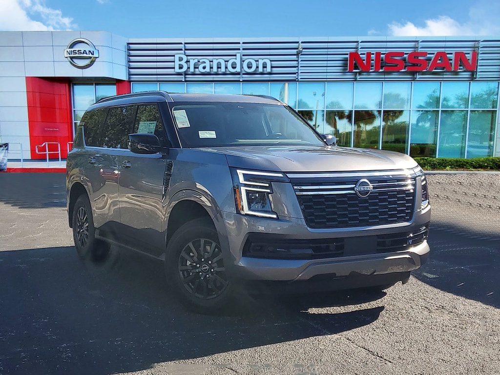 New 2026 Nissan Armada SV [B11] CENTER FRONT SPOILER, [B92] SPLASH GUARDS, GUN METALLIC, CHARCOAL LEATHERETTE SEAT TRIM, [L93] CARPETED FLOOR MATS W/BENCH SEAT -inc: cargo area protector first aid kit and cargo blocks, Turbocharged, Remote Engine Start, Rear Wheel Drive, Tow Hitch, Power Steering, ABS, 4-Wheel Disc Brakes, Brake Assist, Aluminum Wheels, Tires - Front All-Season, Tires - Rear All-Season, Conventional Spare Tire, Tow Hooks, Tow Hooks, Power Mirror(s), Rear Defrost, Privacy Glass, Intermittent Wipers, Variable Speed Intermittent Wipers, Rain Sensing Wipers, Rear Spoiler, Running Boards/Side Steps, Power Door Locks, Daytime Running Lights, Automatic Headlights, LED Headlights, Automatic Highbeams, AM/FM Stereo, Satellite Radio, MP3 Capability, Bluetooth Connection, Telematics, Auxiliary Audio Input, HD Radio, Smart Device Integration, Requires Subscription, MP3 Capability, Steering Wheel Audio Controls, Bluetooth Connection, Power Driver Seat, Power Passenger Seat, Bucket Seats, Pass-Through Rear Seat, Rear Bench Seat, Adjustable Steering Wheel, Trip Computer, Power Windows, 3rd Row Seat, Leather Steering Wheel, Keyless Entry, Power Door Locks, Keyless Start, Keyless Entry, Power Door Locks, Universal Garage Door Opener, Cruise Control, Adaptive Cruise Control, Climate Control, Multi-Zone A/C, A/C, A/C, Rear A/C, Woodgrain Interior Trim, Premium Synthetic Seats, Driver Vanity Mirror, Passenger Vanity Mirror, Driver Illuminated Vanity Mirror, Passenger Illuminated Visor Mirror, Keyless Start, Smart Device Integration, Requires Subscription, Smart Device Integration, Power Windows, Power Door Locks, Trip Computer, Security System, Immobilizer, Cruise Control Steering Assist, Traction Control, Stability Control, Traction Control, Front Side Air Bag, Telematics, Requires Subscription, Rear Parking Aid, Blind Spot Monitor, Cross-Traffic Alert, Rear Collision Mitigation, Lane Departure Warning, Lane Keeping Assist, Lane Departure Warning, Front Collision Mitigation, Driver Monitoring, Tire Pressure Monitor, Driver Air Bag, Passenger Air Bag, Front Head Air Bag, Rear Head Air Bag, Passenger Air Bag Sensor, Knee Air Bag, Driver Restriction Features, Child Safety Locks, Back-Up Camera