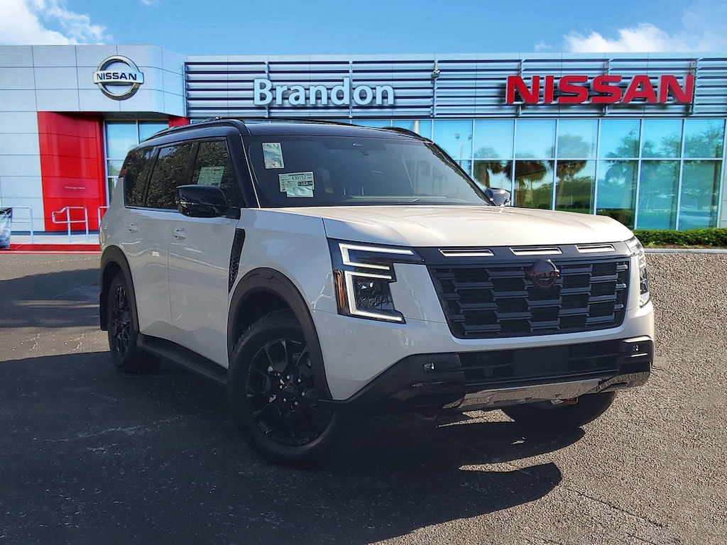 New 2026 Nissan Armada PRO-4X [K02] PRO-4X PREMIUM PACKAGE W/SPLIT BENCH -inc: Homelink UGDO In-Car Camera Intelligent Rear View Mirror (I-RVM) autodimming Intelligent Dash Cam Panoramic Moonroof Heated 2nd Row Seats Biometric Cooling Hands-Free Power Liftgate Climate Controlled Heated & Ventilated Front Seats 12-way power front seats w/4-way power lumbar, [B93] PRO-4X MUD GUARDS, [B95] CROSS BARS, ASPEN WHITE TRICOAT/SUPER BLACK, [T11] FRONT TOW HOOKS, [L94] PRO-4X CARPETED FLOOR MATS W/BENCH SEAT -inc: cargo area protector first aid kit and cargo blocks, [E07] PREMIUM PAINT & 2-TONE ROOF, CHARCOAL PRO-4X LEATHER QUILTED INSERT SEAT TRIM -inc: stitching, [B94] REAR BUMPER PROTECTOR, [N92] ILLUMINATED KICK PLATES, Turbocharged, Remote Engine Start, Four Wheel Drive, Locking/Limited Slip Differential, Tow Hitch, Air Suspension, Active Suspension, Power Steering, Air Suspension, Air Suspension, ABS, 4-Wheel Disc Brakes, Brake Assist, Aluminum Wheels, Tires - Front All-Terrain, Tires - Rear All-Terrain, Temporary Spare Tire, Tow Hooks, Tow Hooks, Heated Mirrors, Power Mirror(s), Integrated Turn Signal Mirrors, Power Folding Mirrors, Rear Defrost, Privacy Glass, Intermittent Wipers, Variable Speed Intermittent Wipers, Rain Sensing Wipers, Rear Spoiler, Running Boards/Side Steps, Remote Trunk Release, Power Liftgate, Power Door Locks, Daytime Running Lights, Automatic Headlights, LED Headlights, Automatic Highbeams, Fog Lamps, AM/FM Stereo, Navigation System, Premium Sound System, Satellite Radio, MP3 Capability, Bluetooth Connection, Telematics, Auxiliary Audio Input, HD Radio, WiFi Hotspot, Smart Device Integration, Requires Subscription, MP3 Capability, Steering Wheel Audio Controls, Bluetooth Connection, Power Driver Seat, Power Passenger Seat, Bucket Seats, Heated Front Seat(s), Driver Adjustable Lumbar, Passenger Adjustable Lumbar, Seat Memory, Pass-Through Rear Seat, Rear Bench Seat, Adjustable Steering Wheel, Trip Computer, Power Windows, WiFi Hotspot, 3rd Row Seat, Leather Steering Wheel, Heated Steering Wheel, Keyless Entry, Power Door Locks, Keyless Start, Keyless Entry, Power Door Locks, Universal Garage Door Opener, Cruise Control, Adaptive Cruise Control, A/C, Rear A/C, Climate Control, Multi-Zone A/C, A/C, Woodgrain Interior Trim, Leather Seats, Driver Vanity Mirror, Passenger Vanity Mirror, Driver Illuminated Vanity Mirror, Passenger Illuminated Visor Mirror, Auto-Dimming Rearview Mirror, Smart Device Integration, Requires Subscription, Smart Device Integration, Mirror Memory, Seat Memory, Keyless Start, Navigation System, Power Windows, Power Door Locks, Trip Computer, Mirror Memory, Seat Memory, Security System, Immobilizer, Cruise Control Steering Assist, Traction Control, Stability Control, Traction Control, Front Side Air Bag, Telematics, Requires Subscription, Rear Parking Aid, Blind Spot Monitor, Cross-Traffic Alert, Rear Collision Mitigation, Lane Departure Warning, Lane Keeping Assist, Lane Departure Warning, Front Collision Mitigation, Driver Monitoring, Aerial View Display System, Tire Pressure Monitor, Driver Air Bag, Passenger Air Bag, Front Head Air Bag, Rear Head Air Bag, Passenger Air Bag Sensor, Knee Air Bag, Driver Restriction Features, Child Safety Locks, Back-Up Camera