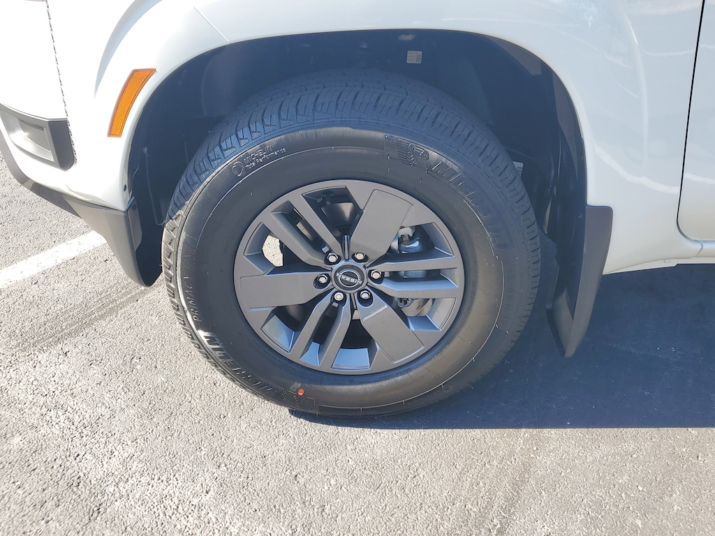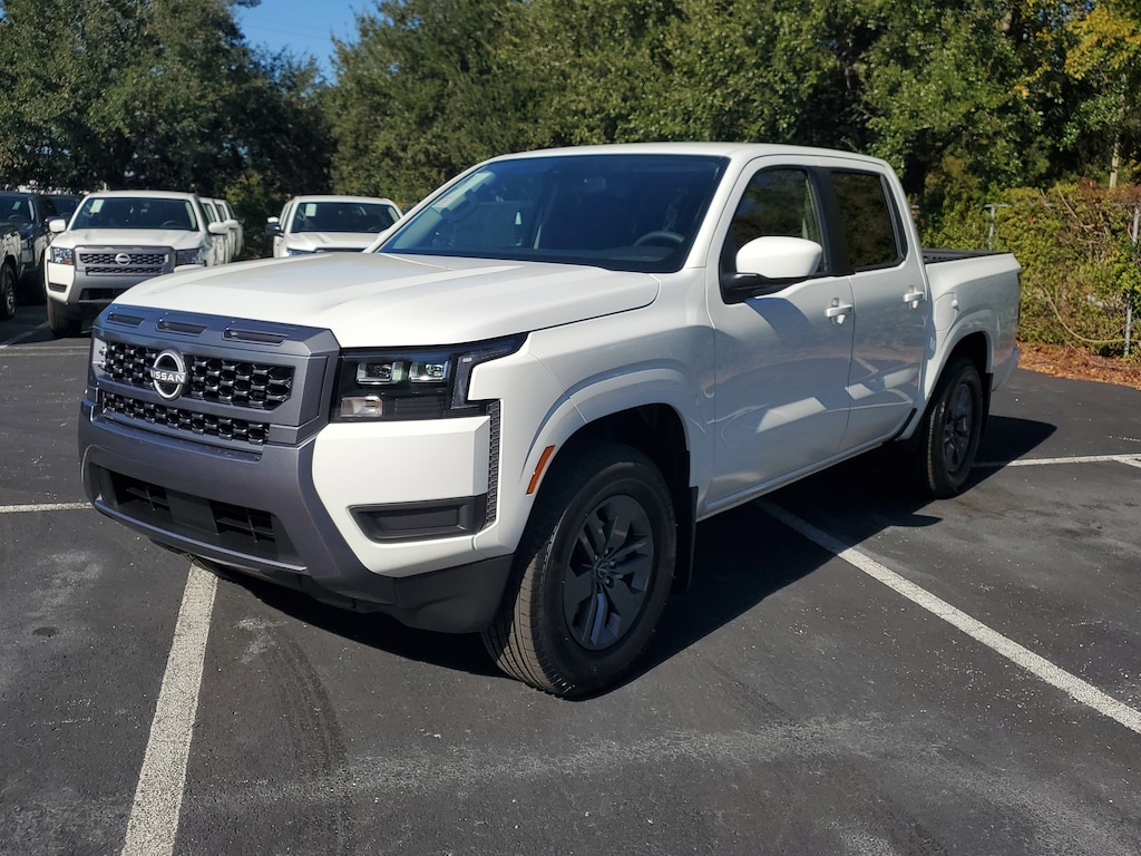 New 2026 Nissan Frontier SV [F92] ELECTRONIC TAILGATE LOCK, [B10] SPLASH GUARDS, CHARCOAL PREMIUM CLOTH SEAT TRIM, [T11] TOW PACKAGE (T11) -inc: tow hitch and tow harness, [K02] SV CONVENIENCE PACKAGE -inc: Bed Under-Rail Lighting Remote Engine Starter 120V Power Outlet in Bed Heated Front Seats Locking Glove Box Utili-Track System 2 adjustable tie-down cleats Spray-In Bedliner Trailer Hitch w/Wiring Harness HVAC - Dual-Zone Front Auto A/C I-Key w/Request Switches on O/S Handles Full-function Heated Leather Steering Wheel Tow/Haul Mode Switch Heated Outside Mirrors 120V Power Outlet in Rear Center Console, GLACIER WHITE, [L93] CARPETED FLOOR MATS -inc: owner's manual portfolio, Rear Wheel Drive, Power Steering, ABS, 4-Wheel Disc Brakes, Brake Assist, Brake Actuated Limited Slip Differential, Aluminum Wheels, Tires - Front All-Season, Tires - Rear All-Season, Conventional Spare Tire, Power Mirror(s), Sliding Rear Window, Privacy Glass, Intermittent Wipers, Variable Speed Intermittent Wipers, Power Door Locks, Automatic Highbeams, Automatic Headlights, LED Headlights, AM/FM Stereo, Satellite Radio, MP3 Capability, Steering Wheel Audio Controls, Bluetooth Connection, Auxiliary Audio Input, Smart Device Integration, Requires Subscription, MP3 Capability, Bluetooth Connection, Power Driver Seat, Bucket Seats, Driver Adjustable Lumbar, Power Driver Seat, Pass-Through Rear Seat, Rear Bench Seat, Adjustable Steering Wheel, Trip Computer, Power Windows, WiFi Hotspot, Keyless Start, Keyless Entry, Power Door Locks, Cruise Control, Adaptive Cruise Control, A/C, Cloth Seats, Driver Vanity Mirror, Passenger Vanity Mirror, Smart Device Integration, Power Windows, Sliding Rear Window, Power Door Locks, Trip Computer, Immobilizer, Security System, Traction Control, Stability Control, Traction Control, Front Side Air Bag, Telematics, Requires Subscription, Rear Parking Aid, Blind Spot Monitor, Cross-Traffic Alert, Rear Collision Mitigation, Lane Departure Warning, Front Collision Mitigation, Driver Monitoring, Tire Pressure Monitor, Driver Air Bag, Passenger Air Bag, Front Head Air Bag, Rear Head Air Bag, Passenger Air Bag Sensor, Front Side Air Bag, Rear Side Air Bag, Knee Air Bag, Child Safety Locks, Back-Up Camera