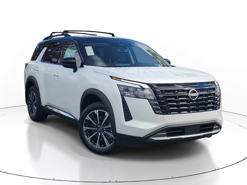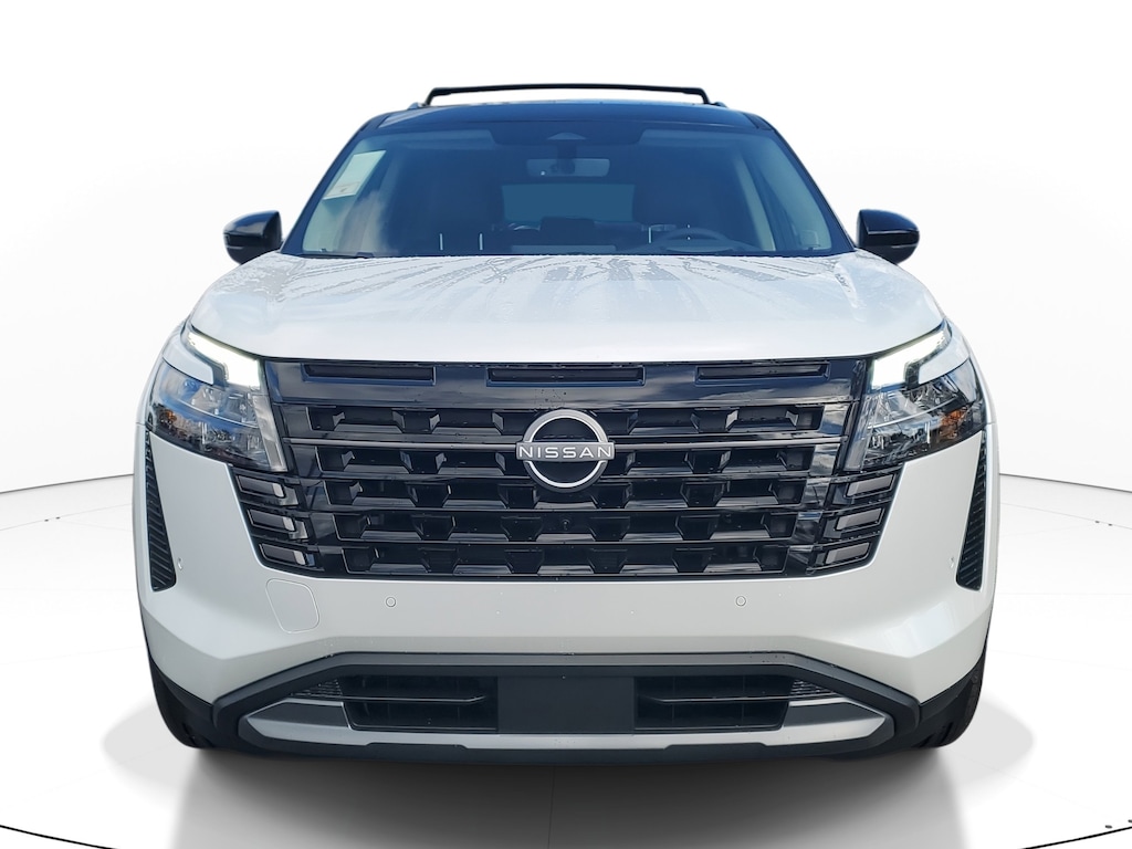 New 2026 Nissan Pathfinder Platinum [L92] BENCH SEAT CARPETED FLOOR MATS -inc: carpeted cargo area protector, CHESTNUT SEMI-ANILINE LEATHER-APPOINTED SEATING SURFACES -inc: quilting, [M92] CARGO PACKAGE -inc: dividers and console net Cargo Area Protector Cargo Net First Aid, [B92] CROSS BARS, [B10] 4-PIECE BLACK SPLASH GUARDS -inc: In plant installation, EVEREST WHITE PEARL TRICOAT/SUPER BLACK, Smart Device Integration, Requires Subscription, Front Wheel Drive, Tow Hitch, Power Steering, ABS, 4-Wheel Disc Brakes, Brake Assist, Brake Actuated Limited Slip Differential, Aluminum Wheels, Tires - Front Performance, Tires - Rear Performance, Temporary Spare Tire, Sun/Moonroof, Generic Sun/Moonroof, Panoramic Roof, Heated Mirrors, Power Mirror(s), Integrated Turn Signal Mirrors, Power Folding Mirrors, Rear Defrost, Privacy Glass, Intermittent Wipers, Variable Speed Intermittent Wipers, Rain Sensing Wipers, Rear Spoiler, Remote Trunk Release, Power Liftgate, Power Door Locks, Daytime Running Lights, Automatic Headlights, LED Headlights, Automatic Highbeams, AM/FM Stereo, Premium Sound System, Satellite Radio, MP3 Capability, Bluetooth Connection, Auxiliary Audio Input, Smart Device Integration, Requires Subscription, MP3 Capability, Steering Wheel Audio Controls, Premium Sound System, Bluetooth Connection, Power Driver Seat, Power Passenger Seat, Bucket Seats, Heated Front Seat(s), Driver Adjustable Lumbar, Passenger Adjustable Lumbar, Seat Memory, Cooled Front Seat(s), Pass-Through Rear Seat, Heated Rear Seat(s), Rear Bench Seat, Adjustable Steering Wheel, Trip Computer, Power Windows, WiFi Hotspot, 3rd Row Seat, Heated Steering Wheel, Keyless Entry, Power Door Locks, Keyless Start, Keyless Entry, Power Door Locks, Hands-Free Liftgate, Universal Garage Door Opener, Cruise Control, Adaptive Cruise Control, Climate Control, Multi-Zone A/C, A/C, A/C, Rear A/C, Woodgrain Interior Trim, Leather Seats, Driver Vanity Mirror, Passenger Vanity Mirror, Driver Illuminated Vanity Mirror, Passenger Illuminated Visor Mirror, Auto-Dimming Rearview Mirror, Smart Device Integration, Remote Engine Start, Keyless Start, Mirror Memory, Seat Memory, Power Windows, Power Door Locks, Trip Computer, Heads-Up Display, Mirror Memory, Seat Memory, Security System, Immobilizer, Cruise Control Steering Assist, Traction Control, Stability Control, Traction Control, Front Side Air Bag, Telematics, Requires Subscription, Cross-Traffic Alert, Rear Collision Mitigation, Cross-Traffic Alert, Front Collision Mitigation, Driver Monitoring, Rear Parking Aid, Blind Spot Monitor, Lane Departure Warning, Lane Keeping Assist, Lane Departure Warning, Aerial View Display System, Tire Pressure Monitor, Driver Air Bag, Passenger Air Bag, Front Head Air Bag, Rear Head Air Bag, Passenger Air Bag Sensor, Front Side Air Bag, Rear Side Air Bag, Knee Air Bag, Driver Restriction Features, Child Safety Locks, Back-Up Camera